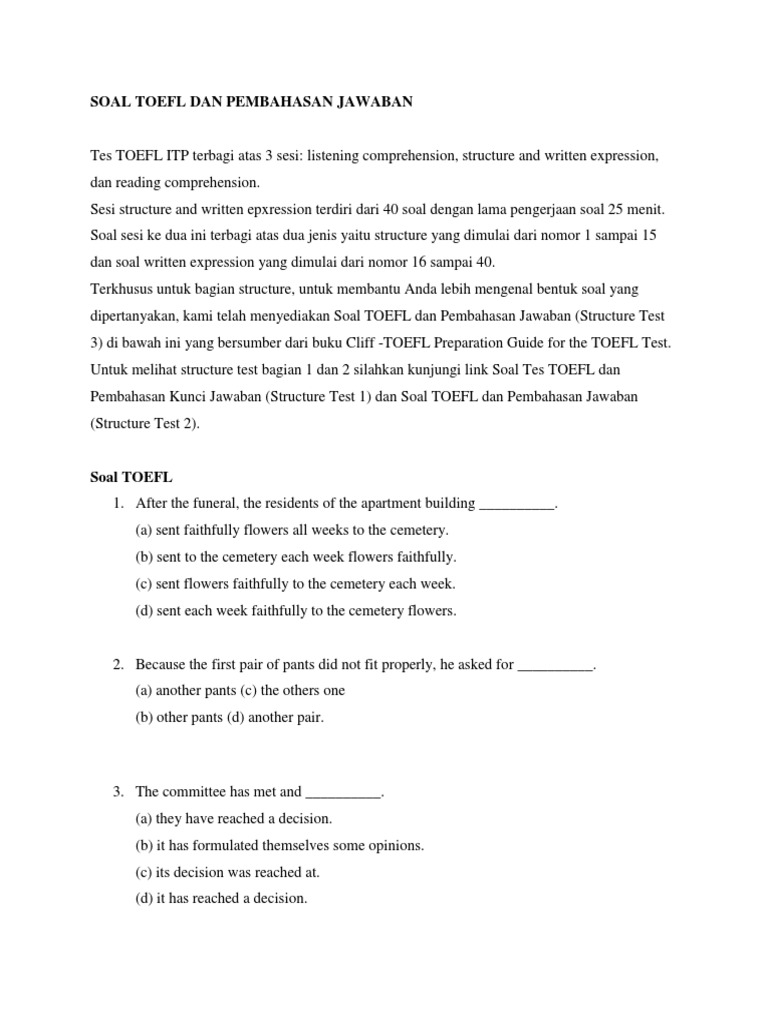 Soal toefl itp dan pembahasannya pdf livinphoenix. There are three parts to this section with special directions for each part. 95%(20)95% found this document useful (20 votes). Contoh soal toefl dan pembahasannya無料ダウンãƒãƒ¼ãƒ‰pdf. 20210114 download toefl soal dan pembahasannya pdf.